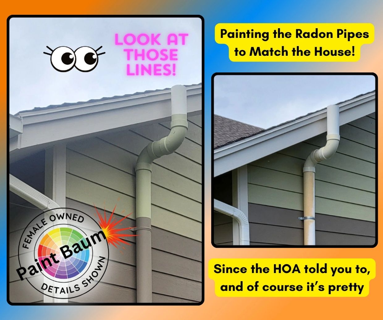 That white radon mitigation pipe doesn’t have to stick out like a sore thumb. We’ll clean, prep, and prime the pipe for proper adhesion, then custom color‑match each section to whatever finish it crosses—foundation, siding body color, trim band, soffit, even roof stack—so it visually “disappears” and keeps your HOA smiling. We protect the fan housing and required system labels, use durable UV‑stable coatings, and cut crisp transitions so every color break looks intentional, not patched. Yes—if all you need is the radon pipe painted, we’re happy to schedule a stand‑alone visit just for that. Let us bring the mitigation up to code and curb appeal.