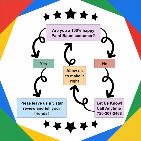 At Paint Baum, our top priority is ensuring 100% customer satisfaction, as demonstrated in our flowchart. We reference our official policy in all bids within the viewing portal, showcasing our commitment to excellence. Our dedication has earned us awards for putting customers and business first, akin to the Level 5 Leadership described in Good to Great byJim Collins. If you are completely satisfied, please leave us a 5-star review and share with your friends. If not, contact us at 720-307-2468, and we will make it right.